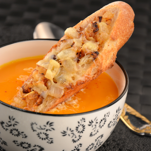 Servez la soupe bien chaude avec sa tartine d’oignons caramélisés.